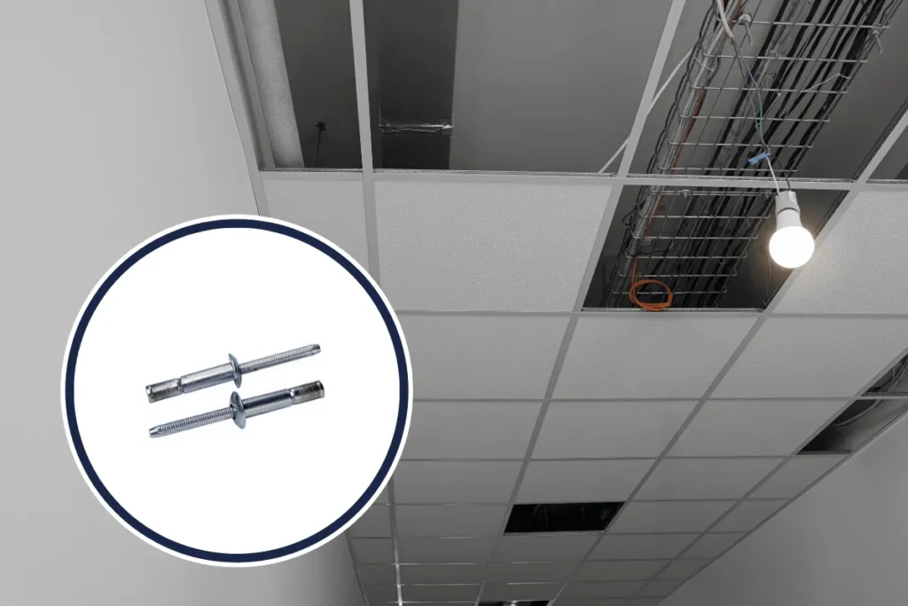 ระหว่างขึ้นโครงสำหรับวางฝ้าเพดาน ต้องยึดปลายโครงด้วยรีเวท และพยายามทำเหลี่ยมมุมทแยงตลอด เพื่อให้รูปทรงโครงฝ้าเป็นสี่เหลี่ยมอย่างสวยงาม