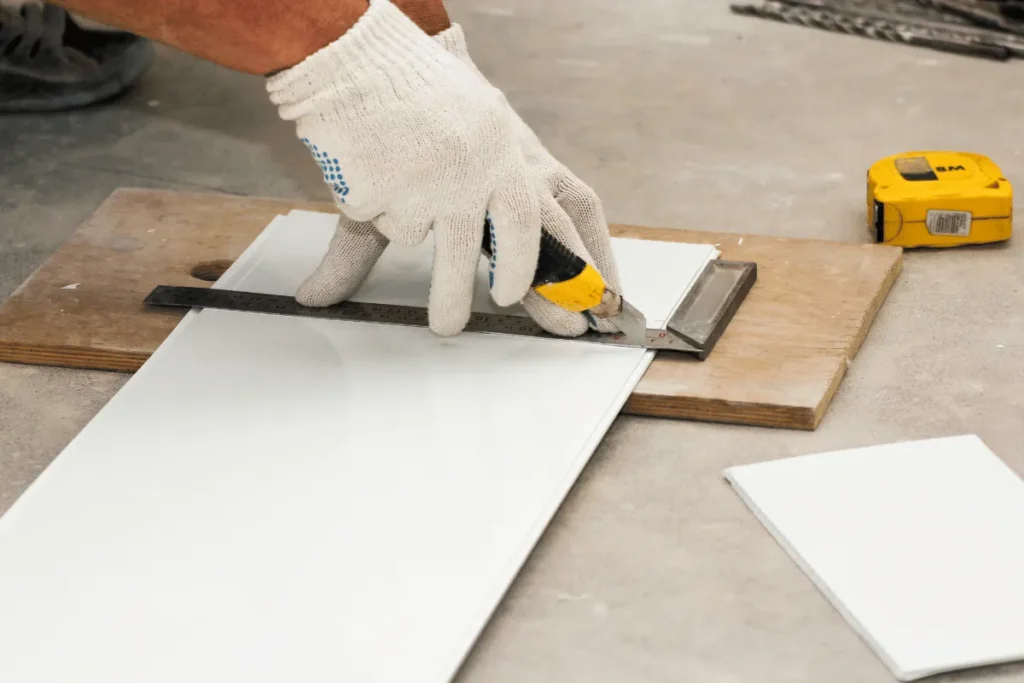 สำหรับแผ่นฝ้าผนังที่มีขนาดใหญ่เกินโครงเหล็ก ให้คุณใช้ไม้เมตรวัดขนาด โครงเหล็กก่อน แล้วค้างไม้เมตรไว้อย่างนั้น จากนั้นก็ทาบไม้เมตรกับแผ่นฝ้า แล้วใช้หัวของไม้เมตร (ส่วนที่เป็นเหล็ก) กรีดลงไปบนฝ้าให้เป็นรอย เพื่อมาร์กจุดที่ต้องตัดแผ่นฝ้าส่วนเกินออก เสร็จแล้วก็ใช้มีดคัตเตอร์จัดการตัดแผ่นฝ้าได้เลย